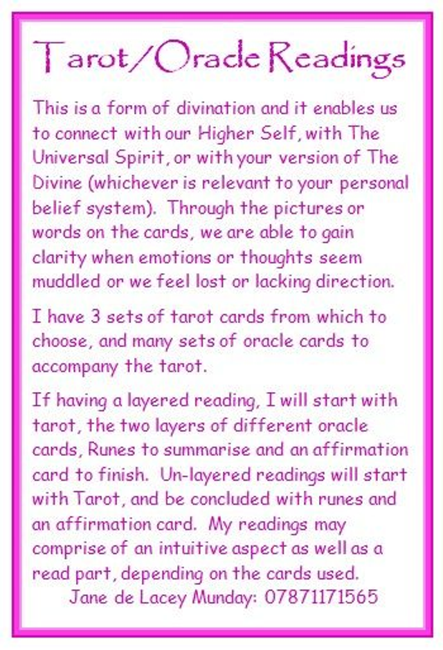The card reading represents Overview, Challenge, Action, OR Mind, Body, Soul, and uses tarot cards and concludes with Runes or Oracle cards and an affirmation.